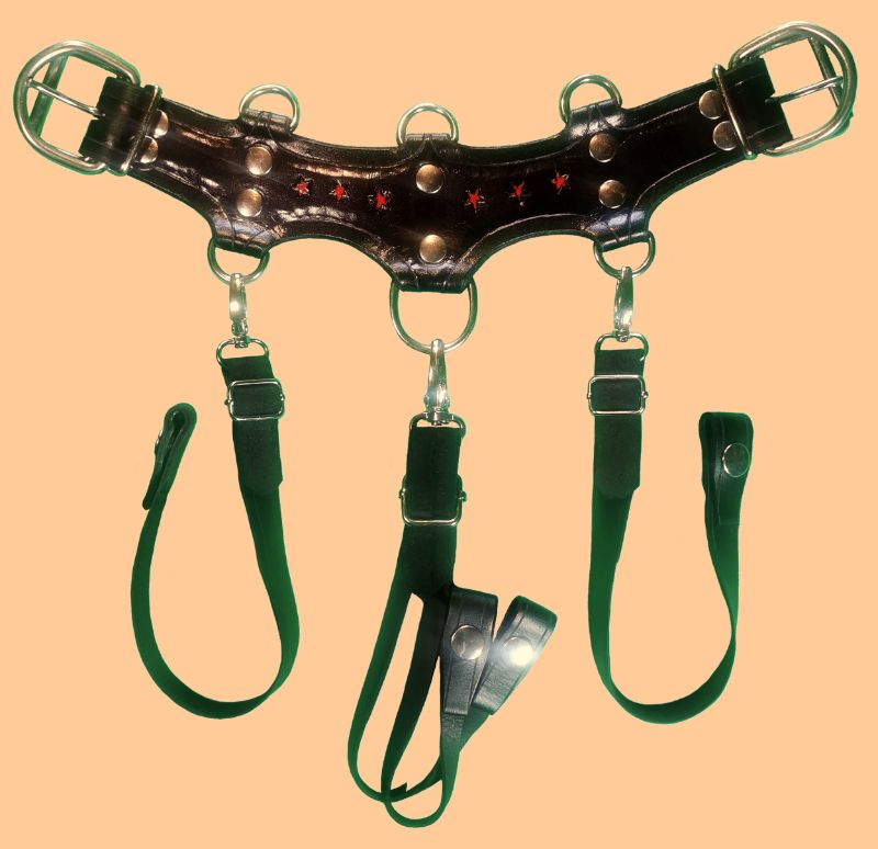 Aufwendig verarbeiteter Leder-Slip der jeder Fixierung standhält, 3 unterschiedliche Schrittbänder je nach Bedarf einfach zu wechseln,